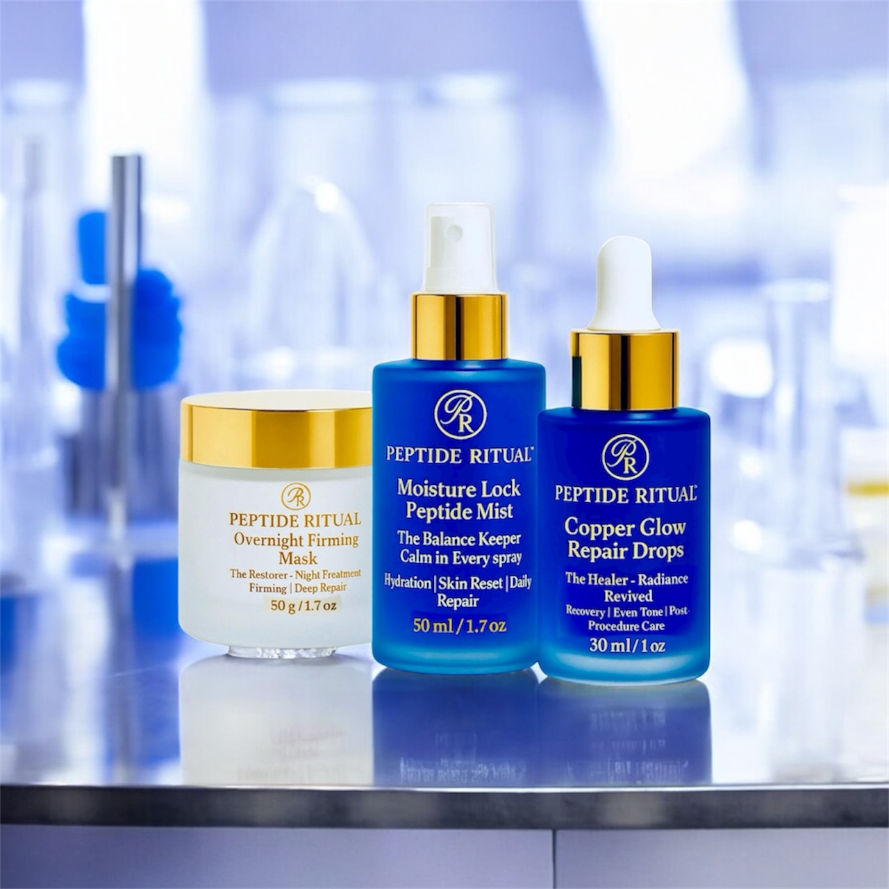 A calming trio that layers resilience into fragile skin. Copper Glow Repair Drops with GHK-Cu, niacinamide, hyaluronic acid, vitamin C, and tranexamic acid refine tone, restore clarity, and illuminate. Moisture Lock Peptide Mist with GHK-Cu and Acetyl Tetrapeptide-5 (Eyeseryl®) refreshes instantly, delivering a veil of hydration and balance. At night, the Overnight Firming Mask with Palmitoyl Tripeptide-1, Palmitoyl Tetrapeptide-7, Tripeptide-3, Hexapeptide-9, and Dipeptide-2 provides a restorative cocoon, leaving skin calm, supple, and renewed by morning.